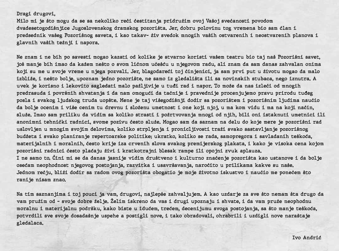 „Ušao sam u ovo pozorište na vrlo neobičan način. Milan Dedinac, koji je ovde bio direktor drame negde 1954. godine, smatrao je da ovo pozorište mora da ima dramaturga. U to vreme na pozorišnoj akademiji nije bilo odseka za dramaturgiju. Ja sam napisao jednu kritiku o Belovićevoj predstavi, koga nisam poznavao, a to je bio Plautov Hvalisavi vojnik, i to se mudrom rukovodstvu Jugoslovenskog dramskog, sa Dedincem na čelu, jako dopalo. Ja sam onda dobio parvo da dolazim u pozorište, da sedim u poslednjim redovima partera, da ćutim i da gledam šta rade velikani, šta radi Mata Milošević, šta radi Bojan Stupica. U to vreme gledao sam Jegora Buličova, kako se sprema Na dnu, Bojana Stupicu kako radi Mirandolinu, Belovića kako sarađuje sa njim na Mirandolini i na drugim predstavama, i tako sam ispekao pozorišni zanat na jedan određeni način i prošao, tako da kažem, od šegrtovanja, kao bibliotekar u Jugoslovenskom dramskom pozorištu. Istovremeno sam bio formalno postavljen za asistenta režije, pa sam morao i da asistiram. To sam radio kod Mate Miloševića, jednu divnu predstavu, predivnu predstavu Ožalošćena porodica, koja bi i danas bila možda najmodernija koja je ikad napravljena. Tu sam zatekao Velibora Gligorića, od koga sam naučio ono za šta je on bio dragocen, a to je da je pozorište društveni čin i da mora biti angažovano na bilo koji način, ali ne direktno; od Dedinca, da je to divan, pravi intelektualni posao. Kad je odlazio, rekao mi je: „Znate šta, sveta dužnost svakog intelektualca na Balkanu je da se ne prepusti nikakvoj formi primitivizma.” Jugoslovensko dramsko je pravi primer toga šta je intelektualni nivo. I ja sam sebi stavio u zadatak da budem na nivou.”